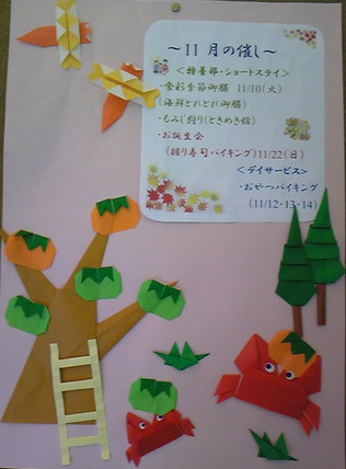 なったここ奈良!もう家ではストーブを出し冬支度をしはじめています。今月のウエルカムボード用の折り紙は「おりがみ通信vol 21に掲載されている「さるかに合戦」を参考に